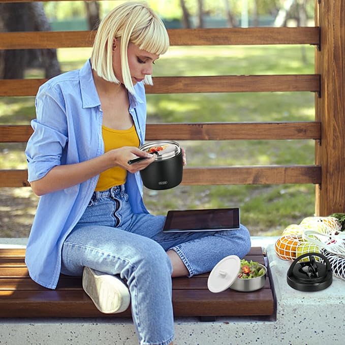- The interior of the food thermo is completely made of food-grade double-wall vacuum insulated stainless steel. The heat resistance insulation technology keeps the food hot for 6 hours or cold for 8 hours. No matter where you are at lunch time, you can enjoy warm food and soup!