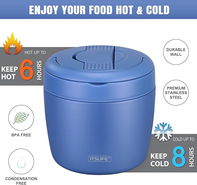 - The interior of the food thermo is completely made of food-grade double-wall vacuum insulated stainless steel. The heat resistance insulation technology keeps the food hot for 6 hours or cold for 8 hours. No matter where you are at lunch time, you can enjoy warm food and soup!