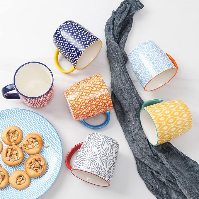 - DELICATED COFFEE MUGS SET - If you are looking for an elegant and stylish mug to make your favorite coffee, this set is great for that. The combination of vibrant colors and various patterns makes you feel classy to drink coffee. They fit your kitchen as well as a restaurant, office, or cafe.