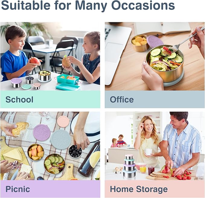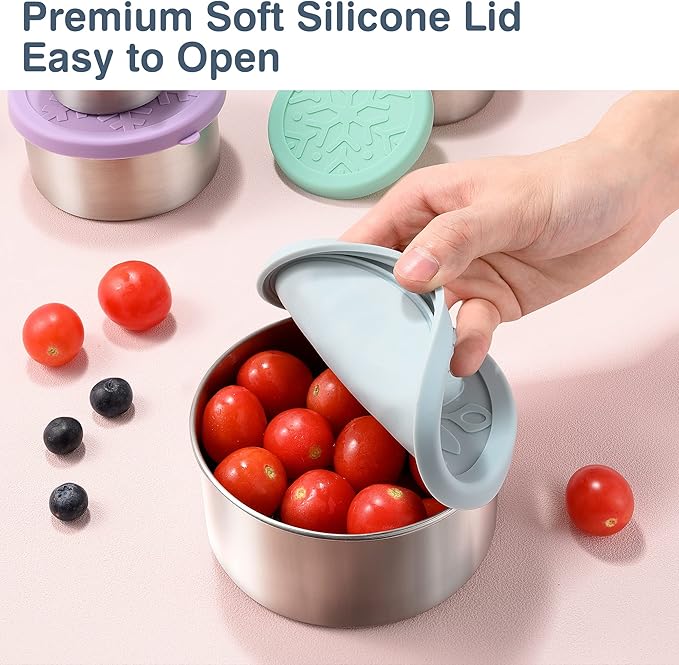 - EASY TO OPEN & LEAK PROOF - The soft silicone lid with small protruding prongs makes it easy for your child to open, and the improved seal design makes these stainless steel food storage containers completely leak-proof, so you can safely put them in your lunch boxes & bags without worry get dirty.