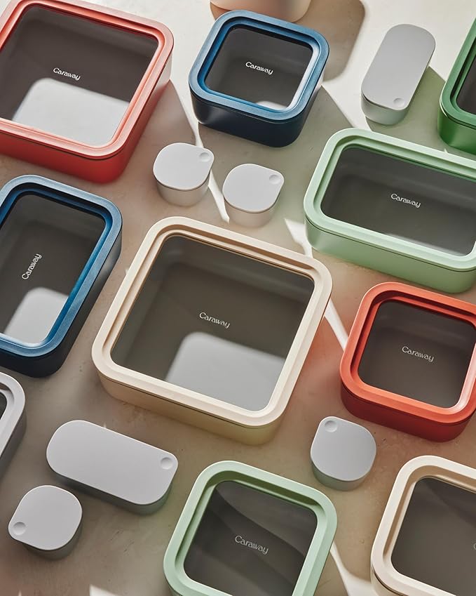 - BEAUTIFULLY DESIGNED: The cleanest, best-looking approach to storing your food. Our glass container set features clear glass lids for easy viewing that puts your leftovers in the spotlight. Each set comes in classic colors that will match with your entire Caraway collection.