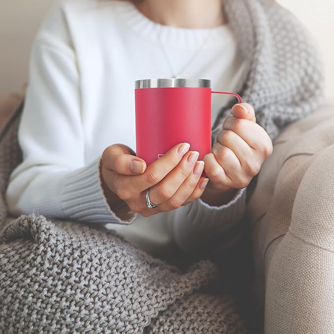 - The 14oz coffee mug with a handle fits most hands, making it easy to hold. It comes with two BPA-free lids – a sliding lid and a flip straw lid – allowing you to switch as needed