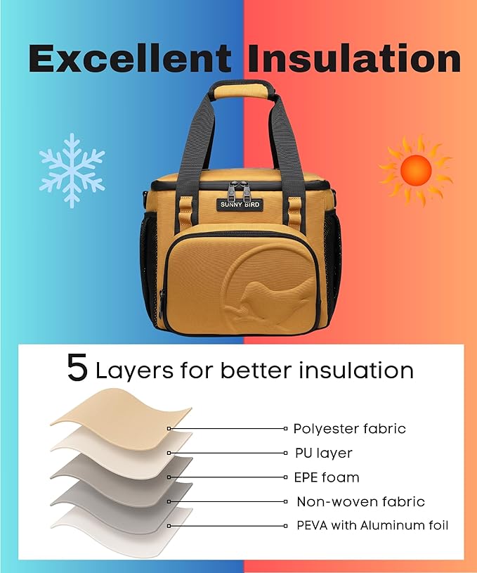 SUNNY BIRD 12L Large Insulated Lunch Bag, Leakproof and Foldable Lunch Cooler Box for Women Adult and Men, Fits 18 Cans (Ochre 01)