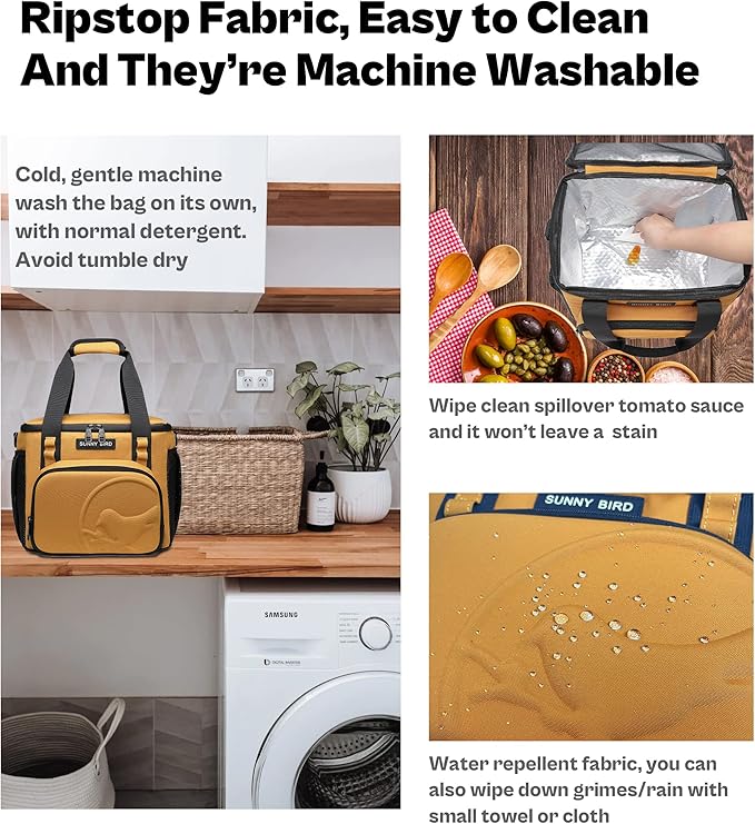 - [Stylish Design and Multifunctional] The aesthetics and functional details make SUNNY BIRD lunchbox feel more retro. The engraved hard shell on the front pocket and the bag lined with sleek ripstop fabrics lend the lunch box a hip and sporty vibe. Plus, a trolley strap for luggage, 4 webbing loops for attaching keys and other small essentials and duo metal zippers to secure your food