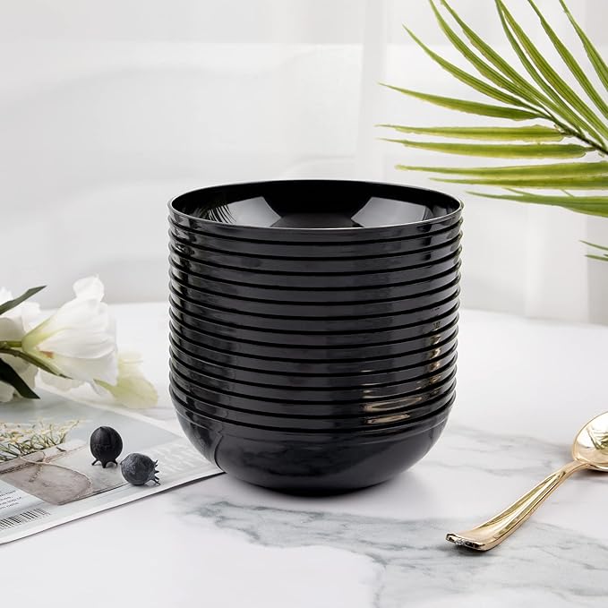 - HUMANIZED DESIGN: These black disposable bowls do not has many edges and corners, which can minimized accidents in parties. A black appearance will great present the food. At the same time, these black bowls are thick enough to hold whatever food you want. Don't worry about them deforming.