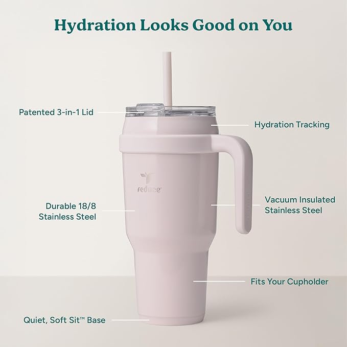 REDUCE Cold1 40 oz Tumbler with Handle - Vacuum Insulated Stainless Steel Water Bottle for Home, Office or Car, Reusable Mug with Straw or Leakproof Flip Lid, Keeps Drinks Cold All Day- Gloss Cotton