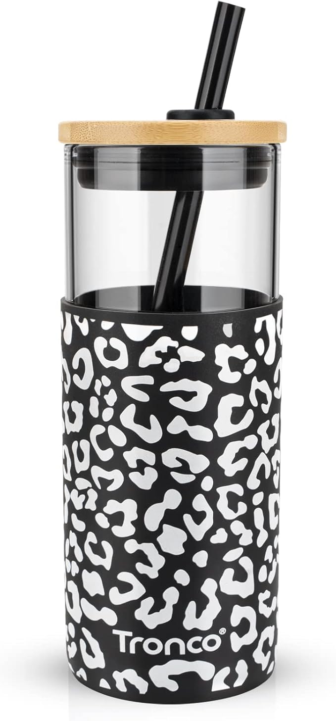 Tronco 20 oz Glass Tumbler with Lid and Straw, Iced Coffee Cup and Smoothie Cup with Bamboo Lids & Protective Silicone Sleeve, Dishwasher Safe, BPA-Free, Glass Cup 1 Pack