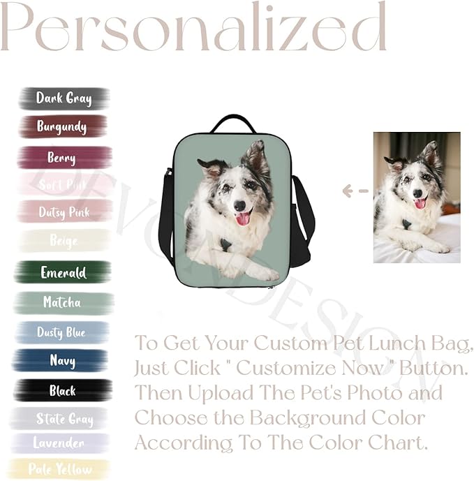 - Customize Your Own Lunch Bag: Personalized pet lunch bag's size is about 8x4x10 inches / 21x11x26 cm. Now clicking "Customize Now" button to add your own design - Select the background color of your choice, find it in the dropdown menu; Upload the pet's photo/picture. We use the latest technology to make quality printing. Your print will be vivid & clear.