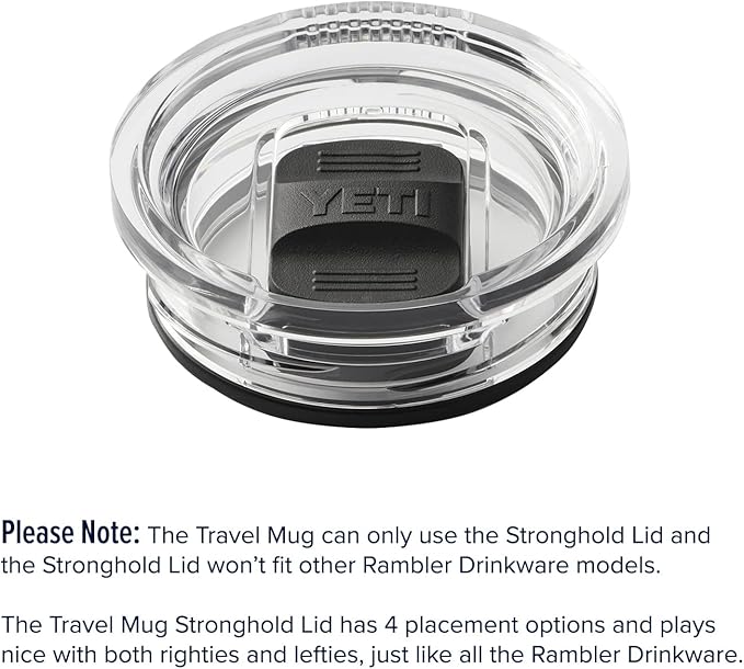 - Please Note: The Travel Mug can only use the Stronghold Lid and the Stronghold Lid won’t fit other Rambler Drinkware models. The Travel Mug Stronghold Lid has 4 placement options and plays nice with both righties and lefties.