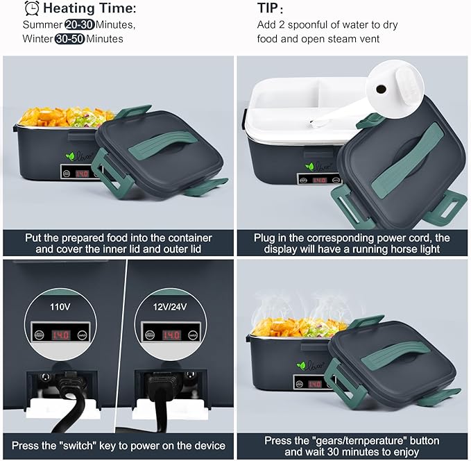 - 【110V/12V/24V 3 in 1 Electric Lunch Box】-- Came with 2 different power cables:110V for home/work use,12V/24V for car/truck use. With this Electric Lunch Box, you can not only heat your meal at home, office, or during travel; but also suitable for the drivers who have to drive on the road for a long time.