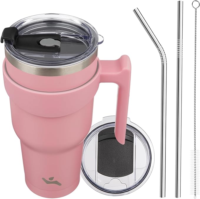 40 oz Tumbler with Handle and 2 Straw 2 Lid, Insulated Water Bottle Stainless Steel Vacuum Cup Reusable Travel Mug, Light Pink