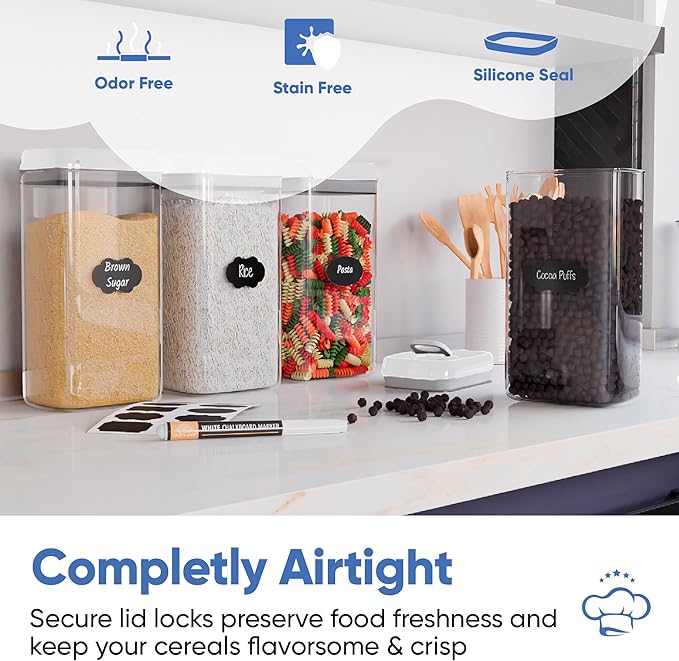 - Space-Saving Design: These stackable clear dry food storage containers help even the newest cook manage their pantry. The noodle storage containers for pantry cupboards includes chalkboard labels and markers for superior pantry organization. Say goodbye to messy kitchen countertops with these plastic containers with lids