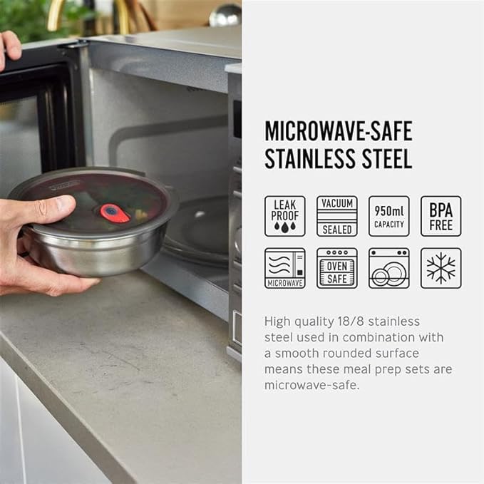 - THOUGHTFULLY DESIGNED - Quality 18/8 stainless steel used in combination with a smooth rounded surface means these food storage lunch bowls are microwave safe, so you can enjoy hot meals on-the-go. Oven (excl. lid), Freezer and Dishwasher safe
