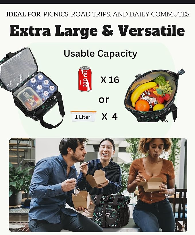- Large Capacity - Measuring 9.5”L x 7”W x 15”H, this lunch bag happily holds up to 16 soda cans (330ml) or four 1-liter lunch containers (up to 7.9"L x 6"W x 3"H, not included), with bonus space for your favorite snacks or fruits! It's great for big appetites, long shifts at work, picnics, beach days, family trips, or road adventures.