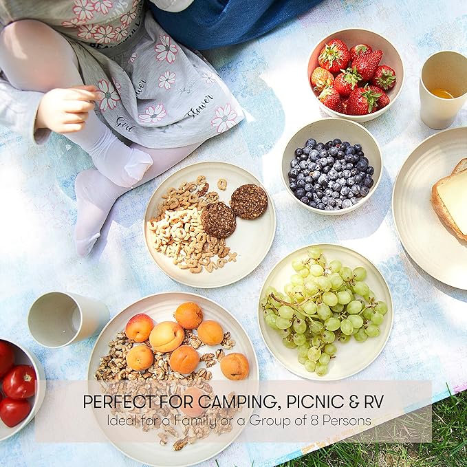 - Multipurpose Dinnerware - Our reusable dishes set for 8 are made for every occasion and will not only be great for home and kitchen use, but also convenient for an rv or camper, a picnic, BBQing, camping, work, school and much more. The unique design allows for easy compact storage as well. You can't go wrong with our wheatstraw dinnerware set.