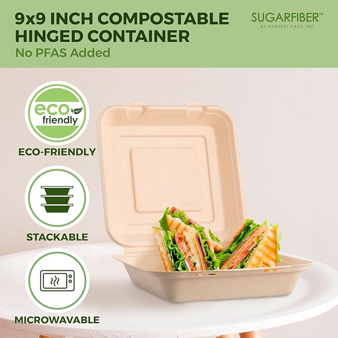 ![[200 COUNT]Sugarfiber by Harvest Pack PFAS FREE 9 X 9" Compostable Clamshell Food Containers, Heavy-Duty Hinged Container, Disposable Bagasse Eco-Friendly Natural Sugarcane Takeout to go Box](http://www.fresorys.com/cdn/shop/files/812067KHz-L._AC_SX679.jpg?v=1761374574&width=1445)