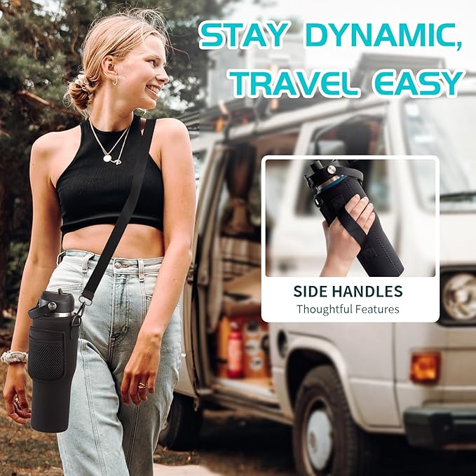 - √ EXTRA PROTECTION & STORAGE (bottle carrier bag & protective boots): The carrying pouch with strap made of neoprene provides full-protect & insulate for your stainless steel tumbler 32oz, and the specially side handle allows grab water bottle easily while driving. The non-slip rubber boot providing extra stability & protective to coffee cup.