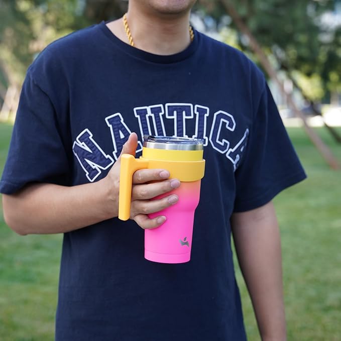 - Designed with a tapered shape and slim-base,the tumbler easily fit in most cup holders. Detachable handle gives versatility to adjust your grip according to your preference or remove it entirely for added flexibility