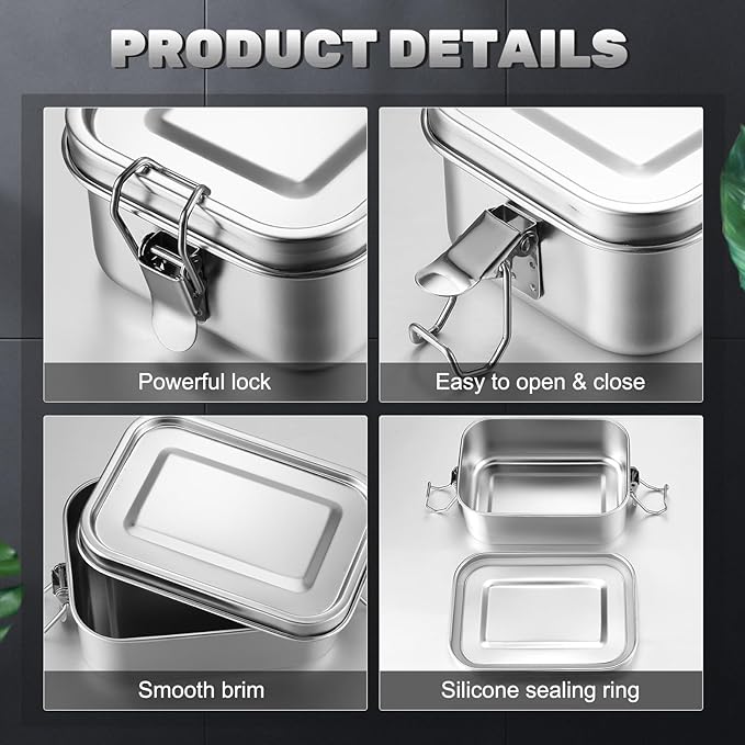 - Lockable Clips for Leak Proof: the metal lunch container is designed with lockable clips that firmly secures the lid in place, avoiding leaks and spills, even when you're outside; This creates a reliable and practical food storage solution, allowing you to pack anything from saucy curries to juicy fruits without any leaks or messes