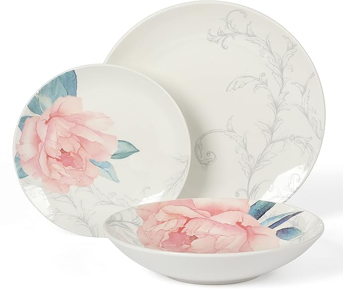 - FLORAL DESIGNS: Peony motifs decorate each plate and bowl to charm any guest with a beautiful place setting