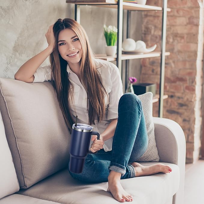 DOMICARE 40 oz Tumbler with Handle and Straw, Stainless Steel Tumbler with Lid and Straw, Reusable Vacuum Insulated Cup, Travel Coffee Mug, Navy Blue, 1Pack