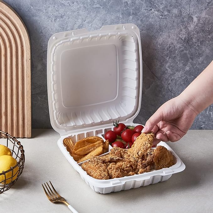 CIAO! 9"x9"x3" MFPP White Hinged Container With Lid 3 Compartment (Case of 150)