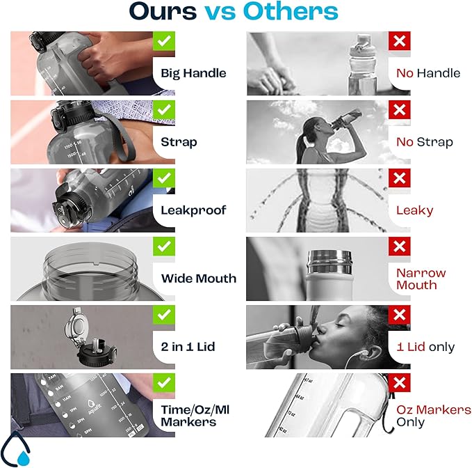 - Track How Much You Drink - Our BPA Free half gallon bottles come with time markers on the side so you can see your daily water intake and stay on track meet your health and fitness goals.