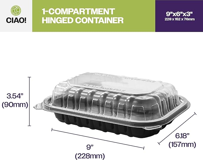 CIAO! 9"x6"x3" Polypropylene Black bottom with Clear Lid Hinged Container 1 Compartment Take Out Container, Microwavable, Recyclable and Reusable, (Case of 150)