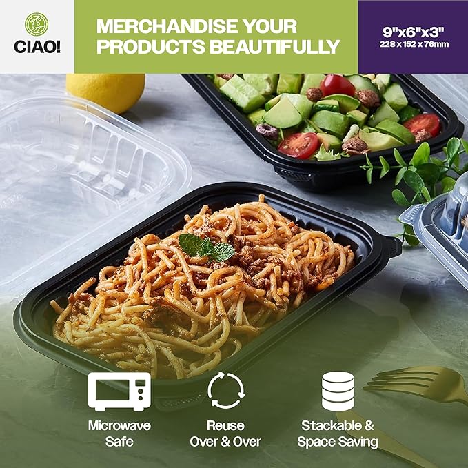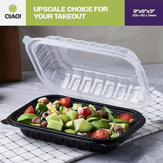 - CIAO! Polypropylene Black Bottom Clear Lid Hinged Containers are the perfect upscale choice for your takeout or food merchandising container for your supermarket. The clear lid provides great clarity to see the quality of your products.