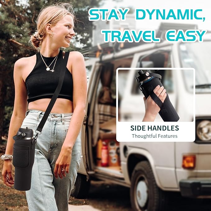 - √ EXTRA PROTECTION & STORAGE (bottle carrier bag & protective boots): The carrying pouch with strap made of neoprene provides full-protect & insulate for your stainless steel tumbler 32oz, and the specially side handle allows grab water bottle easily while driving. The non-slip rubber boot providing extra stability & protective to coffee cup.