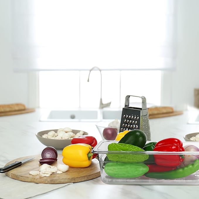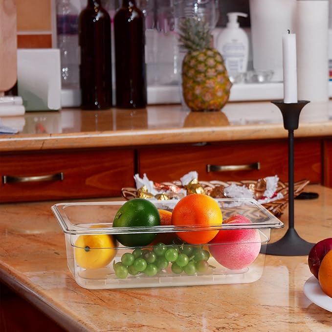 Sunnyray 6 Set 1/3 Size Polycarbonate Food Pans with Lids and Drain Shelf Clear Square Food Storage Containers for Kitchen Restaurant Fruit Vegetable Food Container and Storage (4 Inch Deep)