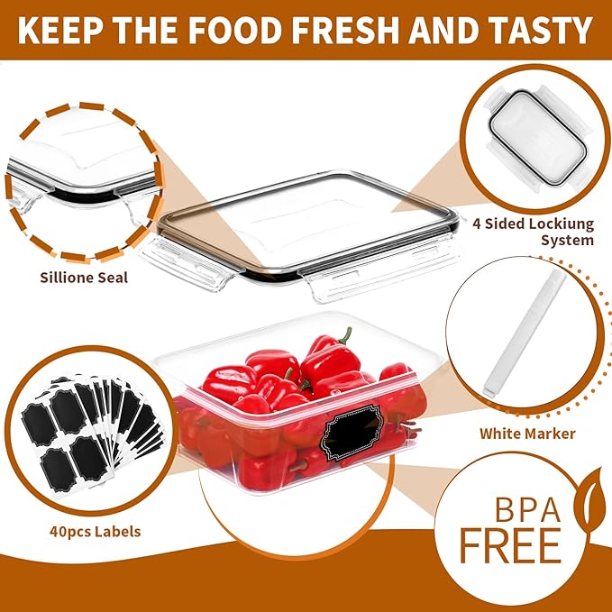 PRAKI 48 Pack Food Storage Containers with Airtight Lids (24 Containers & 24 Lids), Kitchen storage containers for Pantry Organizers and Storage, Meal Prep Container with Labels & Marker