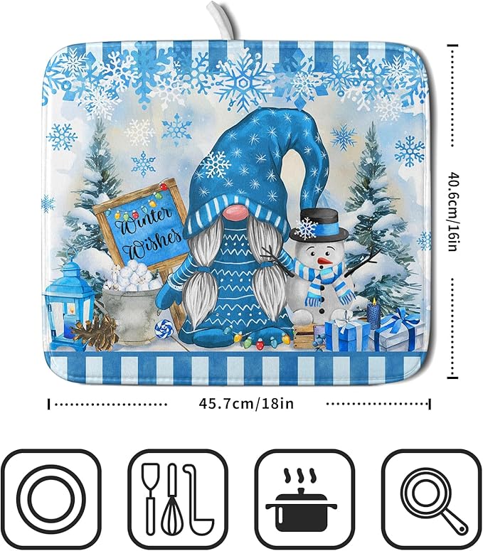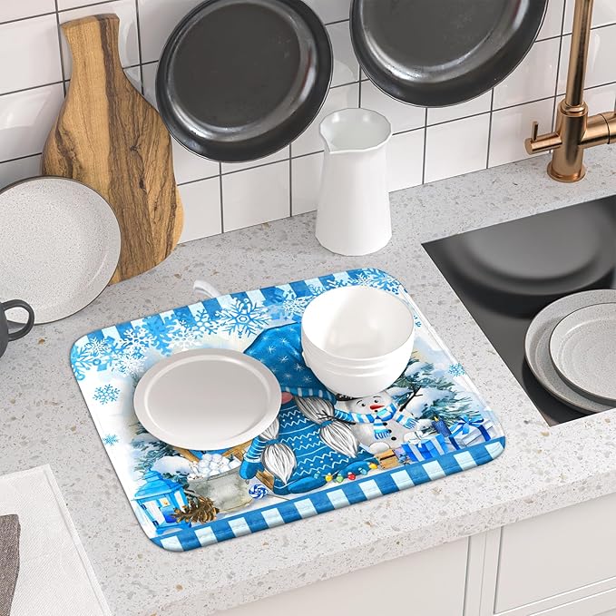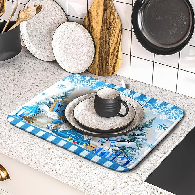 - 【ABSORBENT MATERIAL】-- This winter holiday dish drying mat is made of absorbent microfiber and composite sponge material in the middle, which quickly absorbs water to keep the kitchen countertop dry and clean. Use alone or together with a dish drainer. Our no-slip base adds stability when drying glassware or other fragile items.