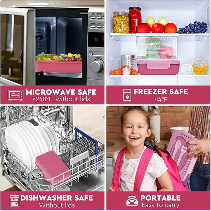 - 【Leak-proof Bento Box】Say goodbye to messy lunches that mix all your food together. The lids of this lunch containers are airtight and leak-proof, thanks to the silicone gaskets that protect each compartment.Now you can enjoy your favorite dressings or sauces without the worry of spillage. Whether you're going to school, having a picnic, or traveling, this lunch box kids seals well and keeps your food in the proper compartments, ensuring a mess-free and enjoyable meal.
