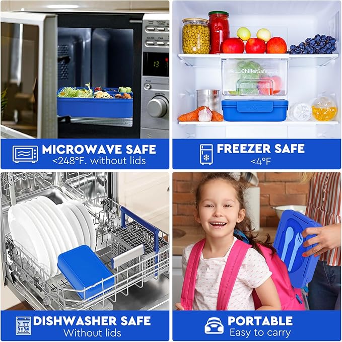 - 【Leak-proof Bento Box】Say goodbye to messy lunches that mix all your food together. The lids of this lunch containers are airtight and leak-proof, thanks to the silicone gaskets that protect each compartment.Now you can enjoy your favorite dressings or sauces without the worry of spillage. Whether you're going to school, having a picnic, or traveling, this lunch box kids seals well and keeps your food in the proper compartments, ensuring a mess-free and enjoyable meal.