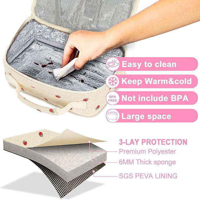 - Simple beige strawberry corduroy Lunch Box, lightweight, suitable for anyone including girls, boys, kids, toddlers take to school or women/men take to work.