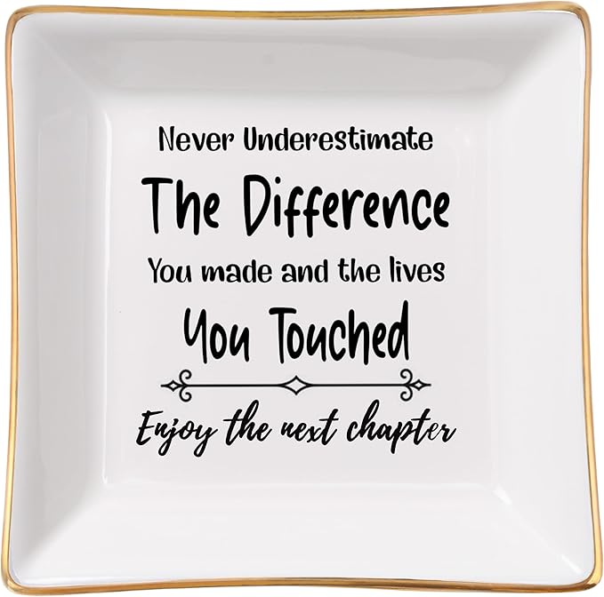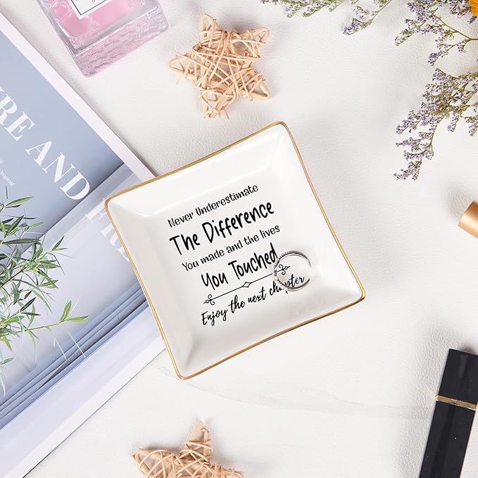 - Gifts for Women: "Never underestimate the difference you made and the lives you touched, enjoy your next chapter”, the meaningful message is printed on an elegant ceramic jewelry dish, suitable for best retirement gifts for women, coworker gifts for women leaving new job promotion gift, boss gifts for women, farewell gifts for coworker leader, teacher retirement gifts, nurse gifts, doctor gifts, gifts for retired women. Comes with thank you quotes, it express your apprecition and best wishes