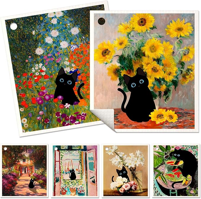 6 Pack Swedish Dishcloths for Kitchen - Reusable Dish Cloths for Washing Dishes Absorbent Cute Funny Kitchen Towels Cleaning Sponge, Floral Cat