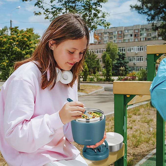 - The screw cap design with seal washer guarantees 100% leak-proof, the hidden handle and hidden folding spoon are designed for easy opening and carrying, and the bottom silicone pad prevents the food jar from moving or tumbling.