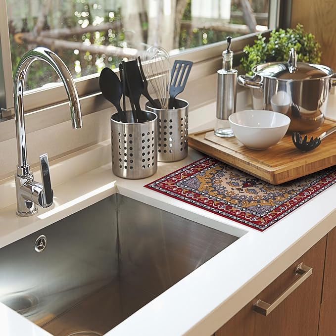 Boho Dish Drying Mat,Persian Original Tribal Drying Rack Pad Countertop Dishes Ultra Absorbent Microfiber Kitchen Counter Mat for Coffee Countertop Decor 18x24 Inch