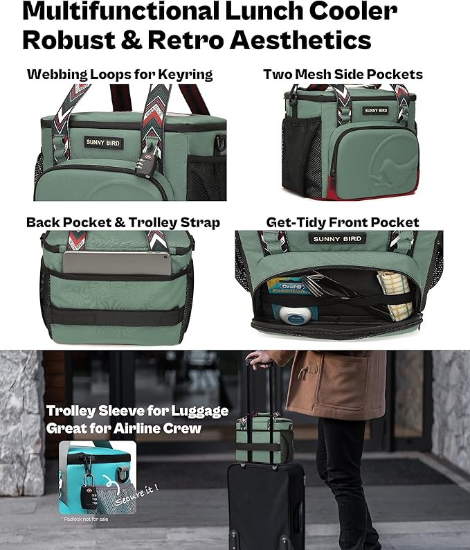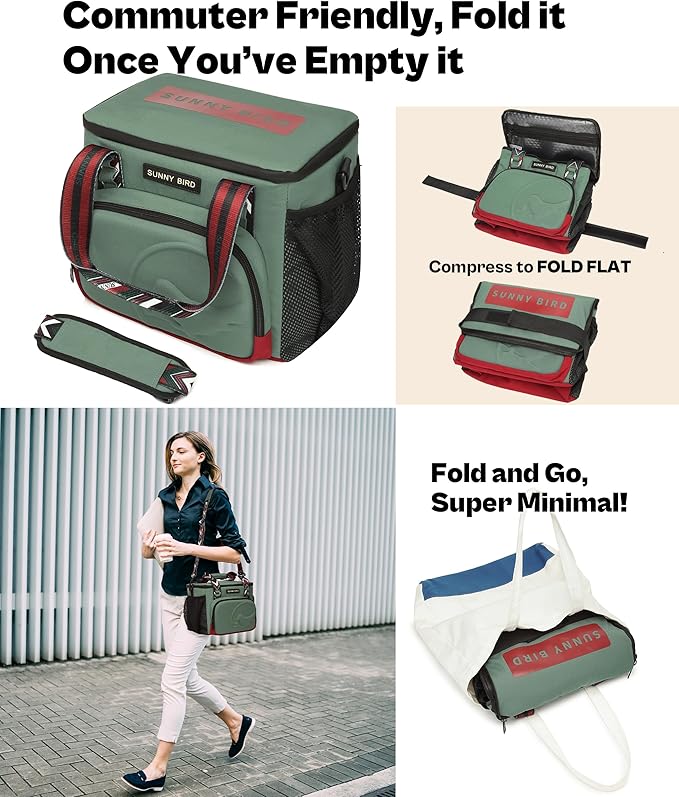 SUNNY BIRD 12L Large Insulated Lunch Bag, Foldable Lunch Cooler Box for Women Adult and Men, Fits 18 Cans (Green with Boho Strap)