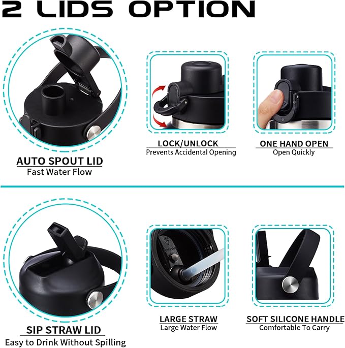 - √ TWO LEAKPROOF & BPA LIDS (Real Sealed): Insulated travel mug with a fast water flow POP-UP spout lid features a button lock to prevent accidental opening. Sip straw lid allow enjoying a cold drink from our insulated coffee mug without worrying splash on the go. Both lids are design for one-hand opening while driving!