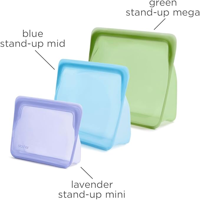- CONTAINS: 3 Stasher Reusable Silicone Bags in the colors Lavender + Blue + Green. Includes 1 Stand-up Mini (28 Fl Oz), 1 Stand-up Mid (56 Fl Oz), and 1 Stand-up Mega (104 Fl Oz) Bag.