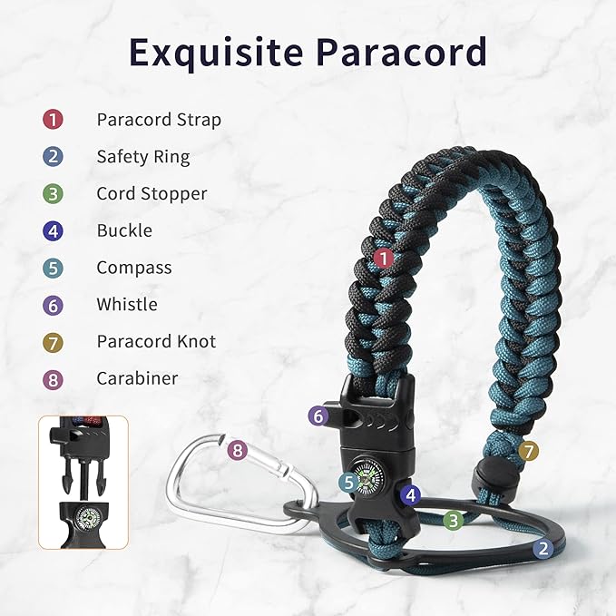 - Full-function Paracord Handle: 32 ounce water bottle come with paracord handle the brilliant paracord of matching colors bring out the bottle with a touch of youthful vibe. Compact compass and handy carabiner make the bottle the ideal survival kit for expeditions in the wild.