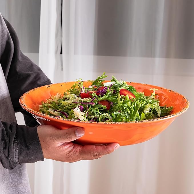 - LARGE CAPACITY SERVING BOWL : The size of orange serving Bowl is 13.75”x 2.75”H that was wide and shallow. the serving pieces are large enough not only perfect for everyday family salad,soups,pasta and stir fries server, also used them as.mixing bowls, storing fruits on the kitchen or dinning table. And it's durable for the patio entertaining, parties, poolside,RVs and BBQ.