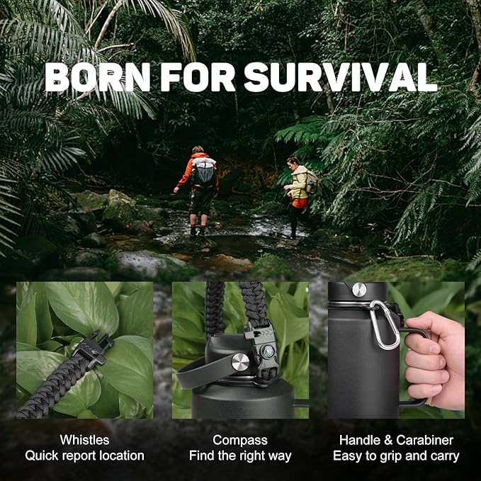 - 【VERSATILE FOR ANY OCCASION】ABOTOCUP insulated water bottle provide a different drinking experience with two lids that are fully leak-proof and designed for effortless drinking. Water bottle with handle perfect for any indoor and outdoor activities. Come with ergonomic handle and Paracord handle with compass, safety ring that built for the toughest.