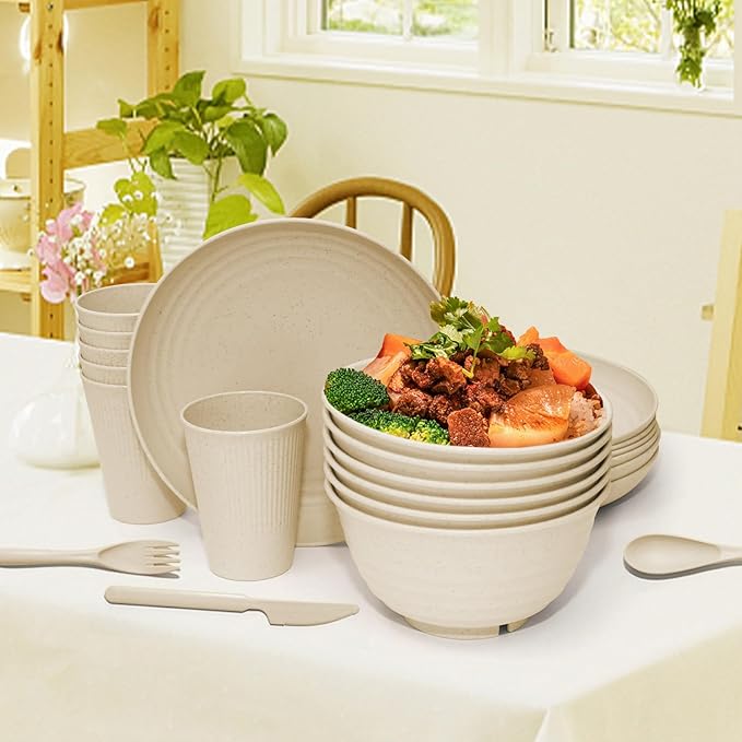 - ECO-FRIENDLY TABLEWARE GIFTS:Compared to ceramic dinnerware, our wheat straw dinnerware set is more lightweight and Easy to clean. It may not be a luxurious gift, but definitely a meaningful one! Awesome gift idea for Christmas, Fathers' Day, Mothers' Day,housewarming, birthday,New Year's Day.etc.