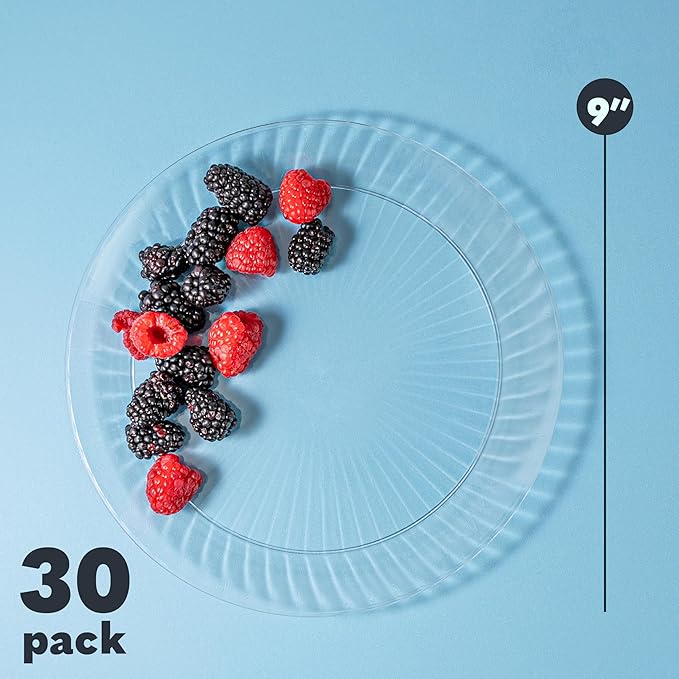 - Pack of 30 9 inch clear plastic dinner plates. For all your dinner and serving needs, use as individual serving dishes or as serving plates.