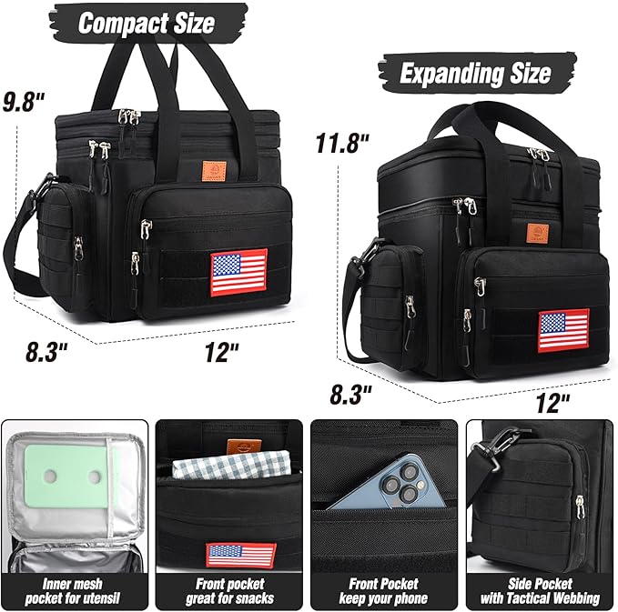 Tactical Lunch Box for Men, Expandable Heavy Duty Double Deck Tactical Lunch Bag with Shoulder Strap, Leakproof & Insulated Lunch Cooler Bag for Adult Work Fishing Picnic Travel,20L (Black)