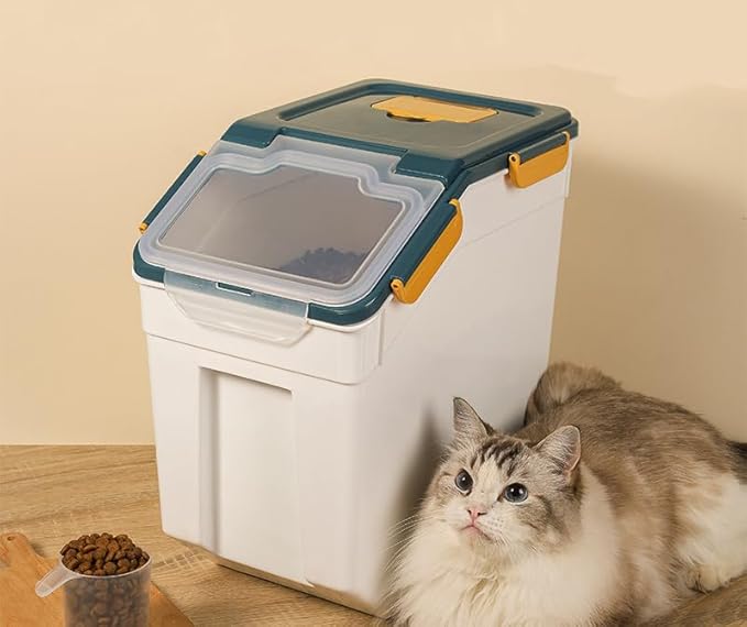 - Large Opening Door & Hidden Wheels: Our cat food storage uses a large clean inclined opening to facilitate finding and taking out food. There are 2 wheels hidden behind the food storage container, you only need to lift the front to move it easily.